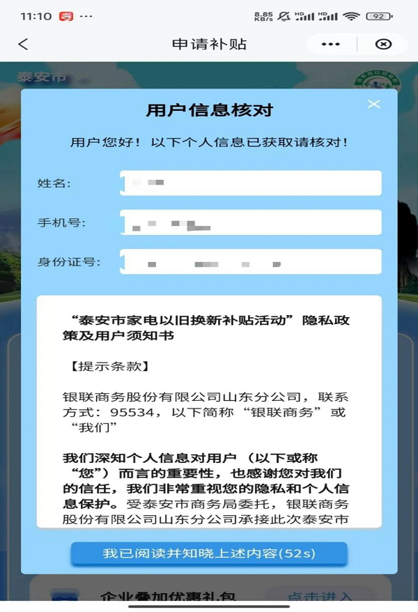 【申請補(bǔ)貼】用戶點(diǎn)擊進(jìn)入“家電補(bǔ)貼券申請”界面,系統(tǒng)彈窗提示授權(quán)申請,用戶同意云閃付 APP 授權(quán)“魯換新”小程序獲取注冊手機(jī)號(hào)、姓名、證件號(hào)信息,進(jìn)入“用戶信息核對”界面,信息核對無誤后,點(diǎn)擊“我已閱讀并知曉上述內(nèi)容”。
