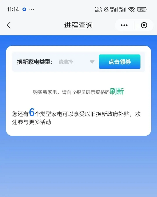 系統(tǒng)校驗(yàn)用戶的以舊換新資格,校驗(yàn)成功后,彈窗提示,用戶點(diǎn)擊確認(rèn),進(jìn)入領(lǐng)券界面,在“換新家電類型”的下拉框中選擇要領(lǐng)券的品類,點(diǎn)擊領(lǐng)券。頁面彈窗提示:“確認(rèn)要領(lǐng)取該類型的政府補(bǔ)貼券嗎?領(lǐng)取成功后將無法修改!”,點(diǎn)擊確定。領(lǐng)券成功,界面顯示以舊換新資格碼。
